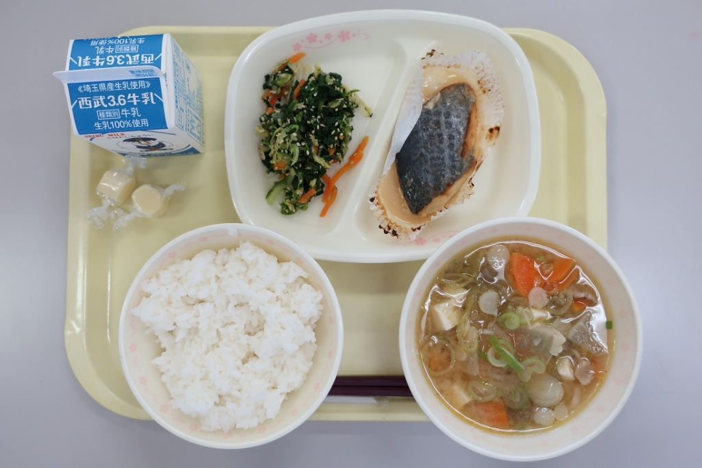 ごはん・鰆のみそマヨネーズ焼き・ほうれん草のごま和え・豚汁・チーズ・牛乳でした。