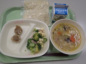 カレーピラフドリア風 牛乳 フライドチキン クリスマスサラダ 野菜コンソメスープ セレクトデザート (クリスマスチョコケーキ・いちごクレープ・ぶどうゼリー) エネルギー:653kcal たんぱく質:24.7g 脂質:19.9g 炭水化物:98....