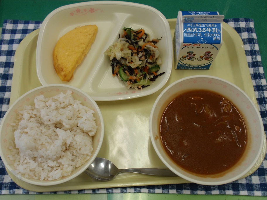 今日は、ハヤシライスでした。ごはんは、麦ごはんです。普通のごはんに比べ、粘り気が少なく、やや固めなのでハヤシライスやカレーなどかむ回数が少なくなってしまうときにぴったりです。
