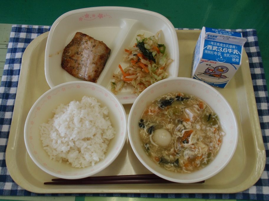 ごはん 牛乳 サワラの明太マヨ焼き 骨太サラダ スタミナスープ エネルギー:585kcal たんぱく質:27.2g 脂質:19.7g 炭水化物:79.6g 食塩相当量:2.3g