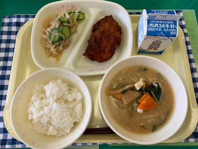 デミカツ丼 牛乳 かきたま汁 花みかん エネルギー:606kcal たんぱく質:26.4g 脂質:17.2g 炭水化物:88.4g 食塩相当量:1.8g