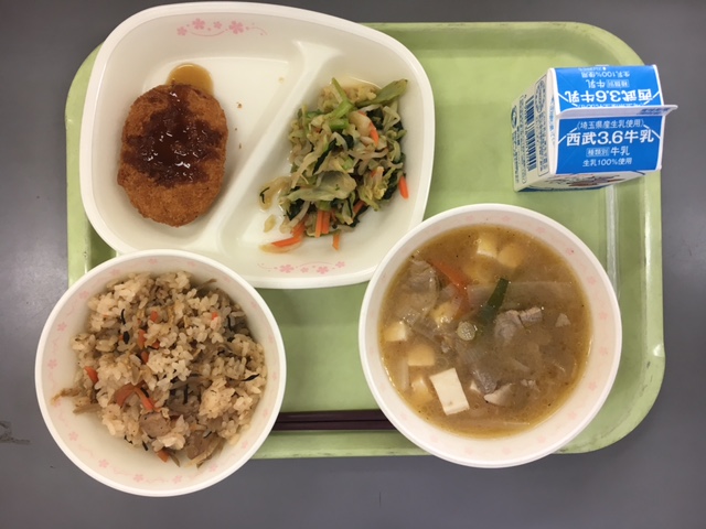 鶏五目ご飯・野菜コロッケ・小松菜の辛子和え・鋳物汁・牛乳でした。
