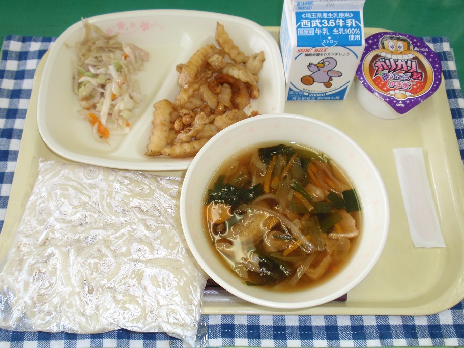 肉うどん 牛乳 チーズ入りいももち 小松菜とじゃこの炒り煮 エネルギー:578kcal たんぱく質:21.2g 脂質:18.1g 炭水化物:84.7g 食塩相当量:3.1g