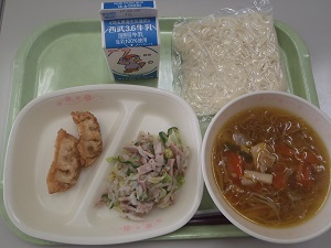 サンマーメン・牛乳・揚げギョーザ・ハムと大根のサラダ