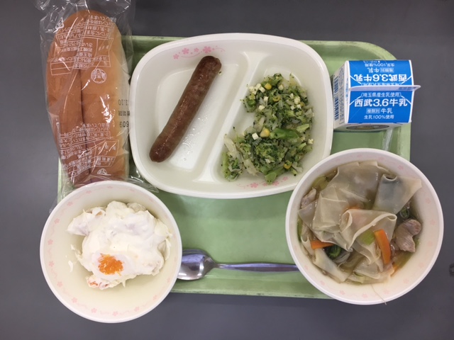 フルーツクリームサンド・焼きウィンナー・ブロッコリーサラダ・わんたんスープ・牛乳でした。