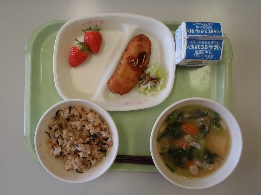 ひじきごはん・白身魚フライ・ゆでキャベツ・じゃがいものみそ汁・いちご・牛乳