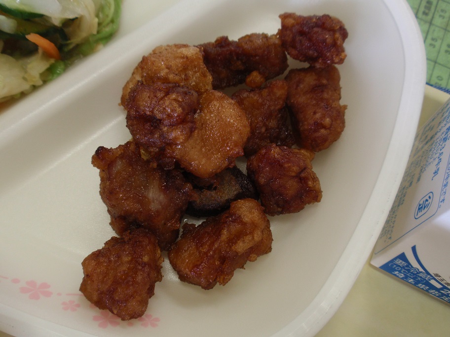 牛乳豚肉と高野豆腐のかりん揚げは、豚肉・豚レバー・高野豆腐にそれぞれ下味をつけ片栗粉をまぶして揚げ、たれをからめています。柔らかく、下味もしっかりついていておいしかったです。