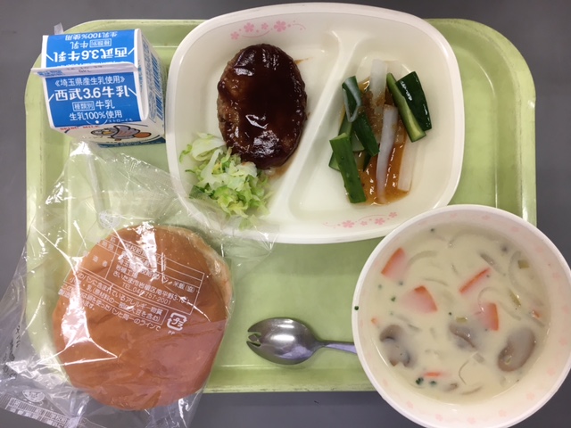 ハンバーガーは、いつもデミグラスソースが多いのですが今日はシンプルにケチャップとウスターソースと砂糖のみのソースでした。ゆできゃべつをはさんで食べるようにしたのですが、配膳の時に残ったものがそのまま残ってしまったクラスがあったので、残念でした・・・