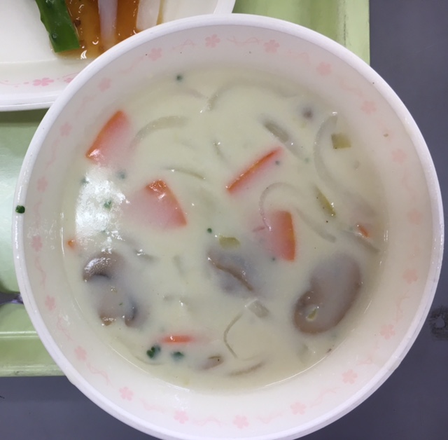 秋の味覚シチューは、この時期にしかでないシチューです。下に沈んで見えないのですが、さつまいもの角切りと、蒸した栗が入っていました。栗の価格が高価だったため、少ししか入れられず、一人1個ぐらいの計算になってしまいました