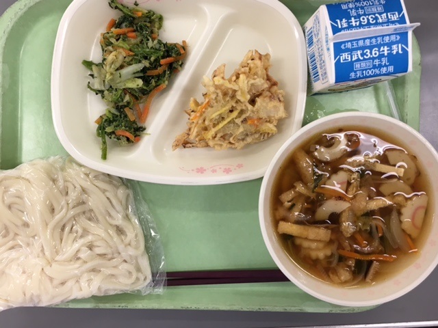 五目うどん・かき揚げ・ほうれん草のごま和え・牛乳
