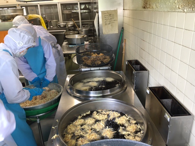 調理員さんが一つずつ入れて作ってくれたので、形はばらばらでしたが手作り感があるかき揚げになりました。1年生は、小さめのものを2こづけにしましたが食べきれない人が多かったみたいで少し残ってしまいました