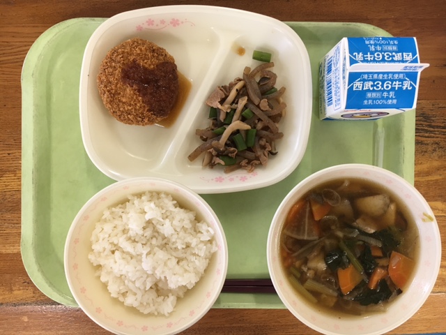 ごはん・キャベツ入りメンチカツ・こんにゃくとシメジのピリ辛炒め・けんちん汁・牛乳