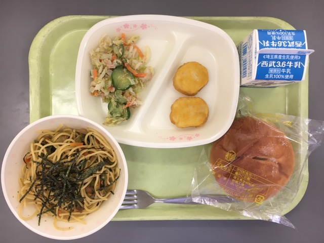 さきたまライスボール・和風スパゲティ・チキンナゲット・ツナとキャベツのサラダ・牛乳でした。