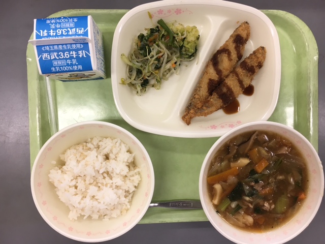 ごはん 牛乳 からあげ ほうれん草とひじきのサラダ 豚汁 エネルギー:632kcal たんぱく質:25.5g 脂質:24.9g 炭水化物:80.6g 食塩相当量:2.4g