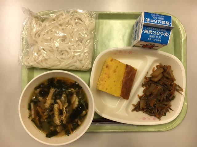 わかめうどん・金平・オレンジパンケーキ・牛乳でした。
