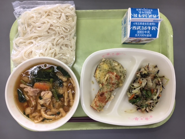 なめこおろしうどん・さつま芋とちくわの天ぷら・ツナとひじきのサラダ・牛乳でした。