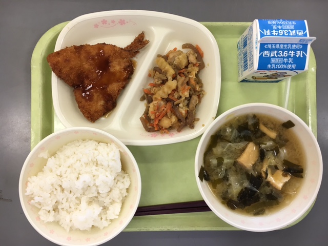 ごはん・アジフライ・じゃが芋の金平・キャベツのみそ汁・牛乳