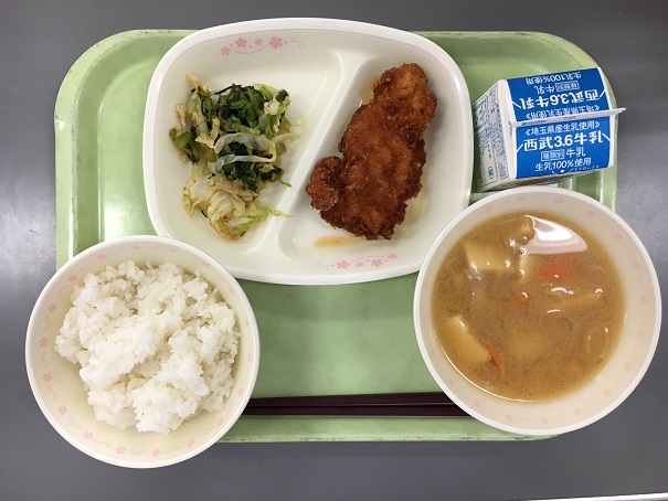カツ丼・おひたし・じゃが芋のみそ汁・牛乳です。