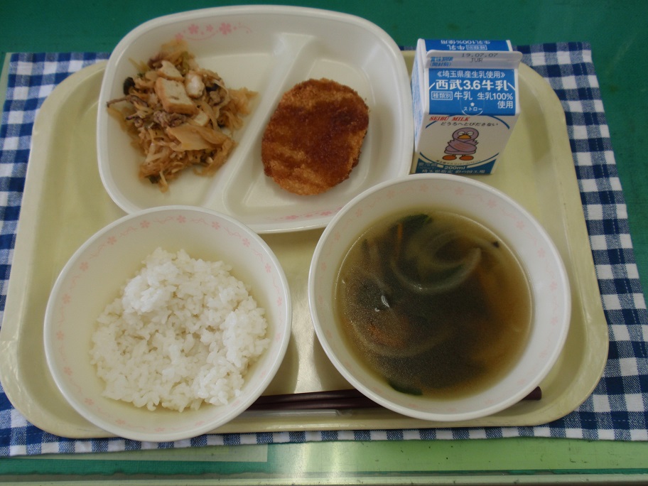 コッペパン 牛乳 焼きそば 焼きウインナー チーズサラダ エネルギー:617kcal たんぱく質:26.1g 脂質:26.8g 炭水化物:72.9g 食塩相当量:2.3g