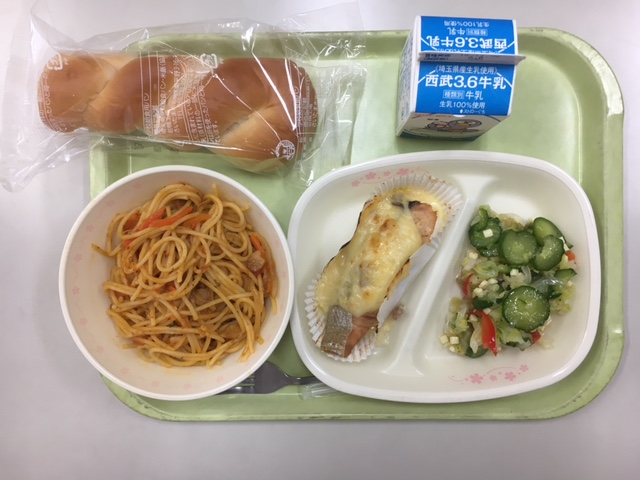 ツイストパン・ピッコロ社特性トマトスパゲティ・ホテルアドリアーノの鮭のクリームソースかけ・イタリアンサラダ・牛乳でした。