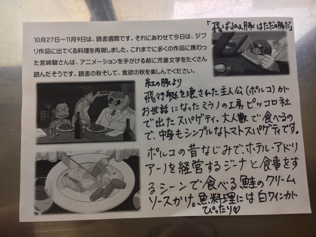 今日10/27は、読書の日です。そこで、作品を手がける前にたくさんの本を読んだといわれる宮崎駿監督の作品「紅の豚」より、給食で再現ができそうなメニューを登場させてみました!イタリアを舞台にした、作品なのでワインに合いそうなメニューです。