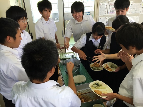 鶏天は、初めての献立です。大分県の郷土料理です。鶏肉に醤油とにんにくで下味をつけ込んであります。卵をつけて、小麦粉と片栗粉を合わせたものを衣としてつけて揚げました。たっぷりの卵を使用したので衣もふわっとしていました。別に作ったポン酢をクラスでかけていただきました。休みで余っていた鶏天もあっという間に売り切れです