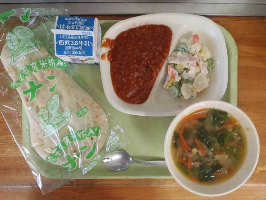 ナン・チリミート・ポテトサラダ・オニオンスープ・牛乳