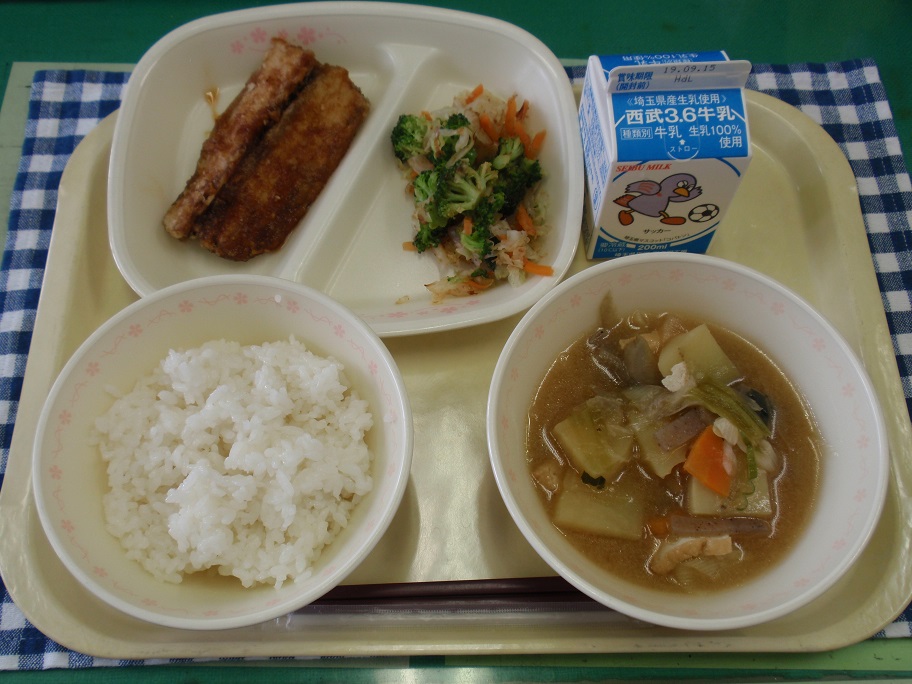 ごはん 牛乳 サワラの明太マヨ焼き 骨太サラダ スタミナスープ エネルギー:585kcal たんぱく質:27.2g 脂質:19.7g 炭水化物:79.6g 食塩相当量:2.3g