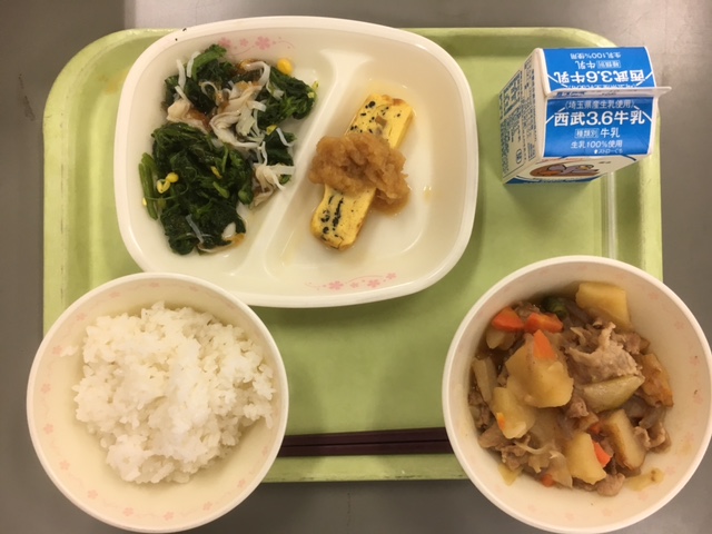 ごはん・ひじき入り厚焼き卵・大根おろし・和風ほうれん草サラダ・肉じゃが・牛乳でした。