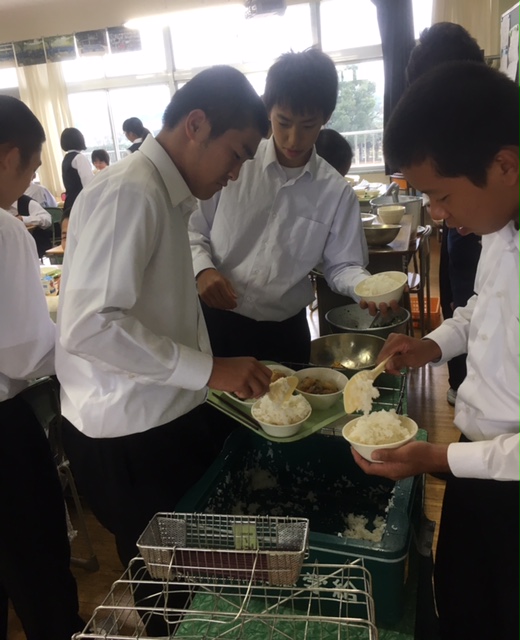 10月現在、南中の中でごはんの量がダントツ多い2-1。今日から部活動も再会なので、ご飯の争奪戦が繰り広げられていました。ワンランクご飯の量を増やさなくちゃかしら・・・職員室のごはんがいつもより余ったのでお裾分けしたら、それもあっという間に平らげてしまいました