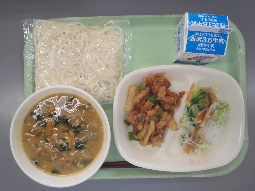 五目うどん 牛乳 青のりポテトビーンズ 春野菜のごまマヨ和え エネルギー:585kcal たんぱく質:24.0g 脂質:21.8g 炭水化物:78.3g 食塩相当量:2.7g