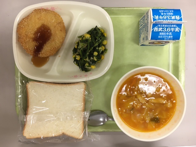 ハムカツサンド・ほうれん草とコーンのソテー・ミネストローネ・牛乳
