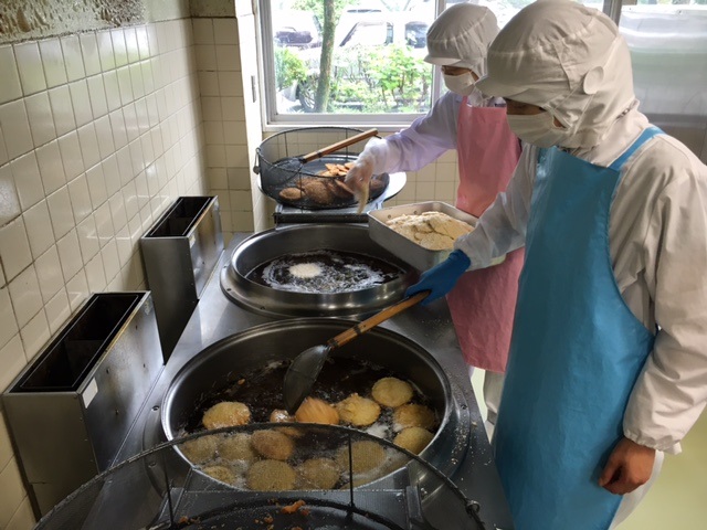 ハムカツは、給食室でハムにうすく小麦粉(これをつけることで、バッター液につけた後のパン粉がはがれにくくなります)→バッター液→パン粉をつけてあげていきます。ピンクのエプロンがハムを入れる人、青のエプロンが調理をしている人とひと目でわかるようになっています。