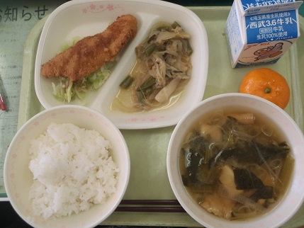 ご飯・牛乳・鮭フライ・糸こんにゃくのカレー炒め