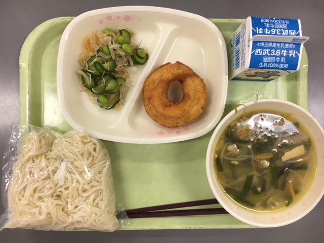 タンメン・大根とじゃこのサラダ・卵ドーナッツ・牛乳でした。