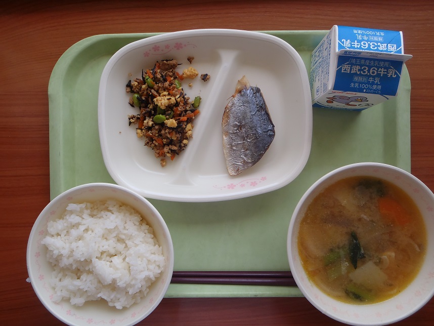 ごはん・鰆のたまり醤油焼き・ひじきのそぼろ煮・野菜椀・牛乳でした。