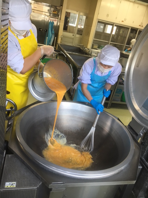 エプロンの色が違うのはなぜでしょうか??黄色はたまごを入れる人、水色が調理をしている人とエプロンの色で作業を区別しています。他にもエプロンがあるので、順次紹介をしていきます!