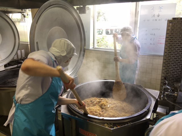 焼きそばは、調理員同士が協力をしないとできないメニューです。焼きそばの麺は、釜と同時平行で蒸しておきます。そうすることで、すぐに温度があがるので麺がぐちゃぐちゃになりません。久々の焼きそばに生徒たちは堪能したようです