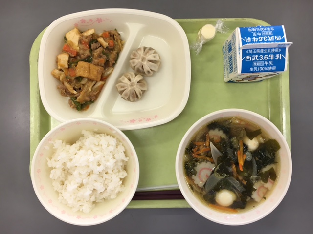 ごはん・ねぎみそ包子・ホイコーロー・わかめスープ・牛乳・チーズでした。