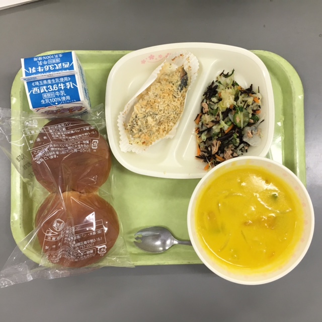 、はちみつパン・白身魚のパン粉焼き・ツナとひじきのサラダ・パンプキンポタージュ・牛乳でした。