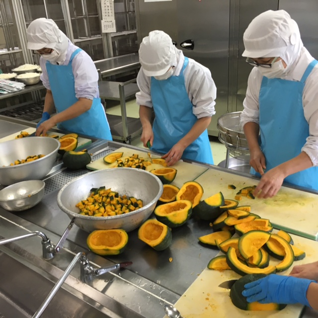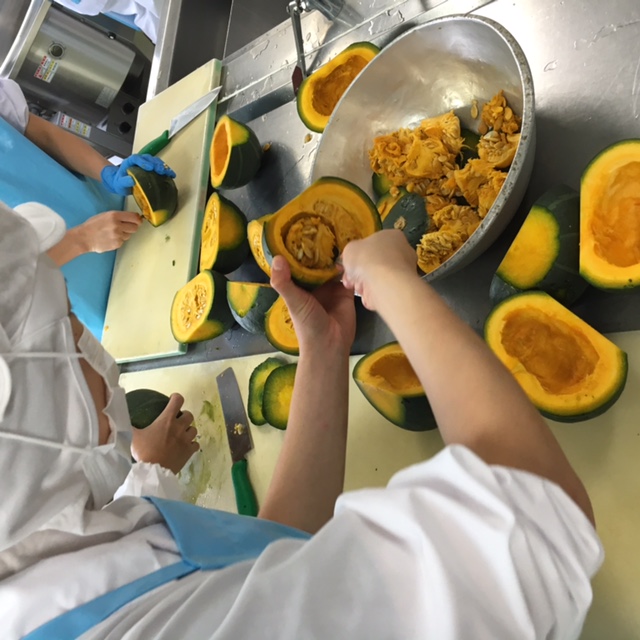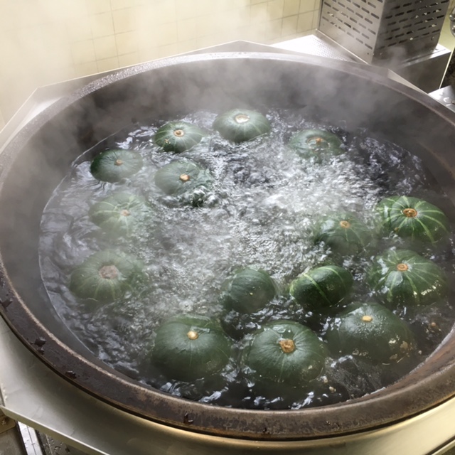 鹿児島からやってきた、大きなかぼちゃを、一度ゆがきます。かぼちゃが温泉に入っているようです