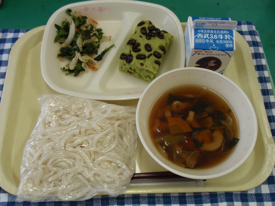 肉うどん 牛乳 チーズ入りいももち 小松菜とじゃこの炒り煮 エネルギー:578kcal たんぱく質:21.2g 脂質:18.1g 炭水化物:84.7g 食塩相当量:3.1g