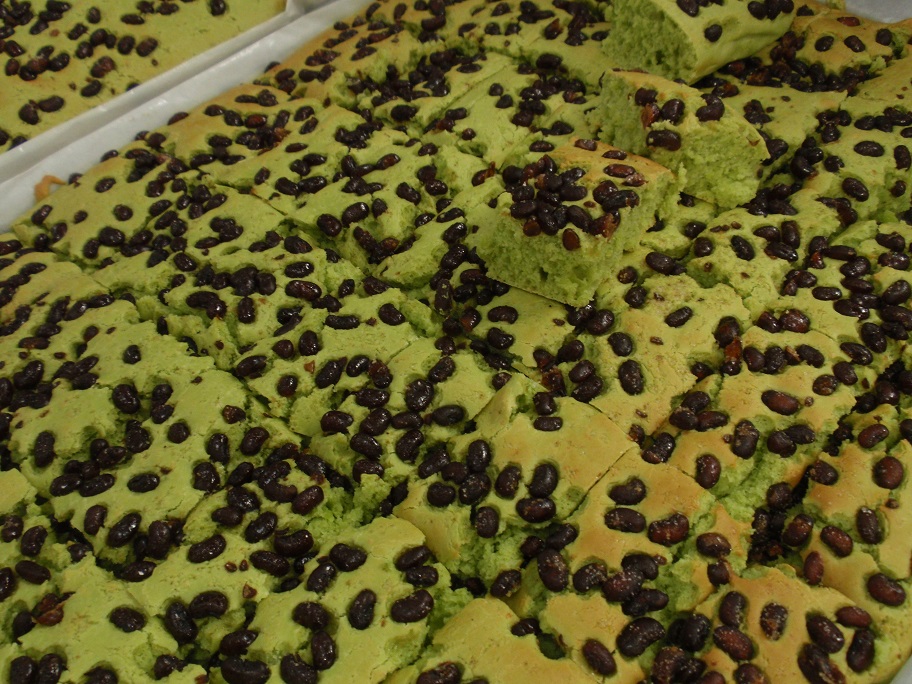 抹茶が入った緑色の生地にたっぷりと甘納豆をのせて焼いています!