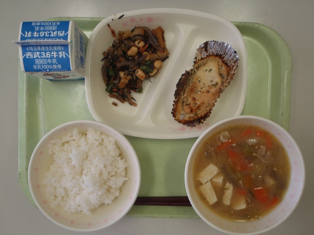 ごはん・鶏肉のマヨネーズ焼き・大豆の磯煮・豚汁・牛乳でした。