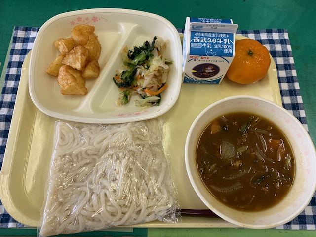 肉うどん 牛乳 チーズ入りいももち 小松菜とじゃこの炒り煮 エネルギー:578kcal たんぱく質:21.2g 脂質:18.1g 炭水化物:84.7g 食塩相当量:3.1g