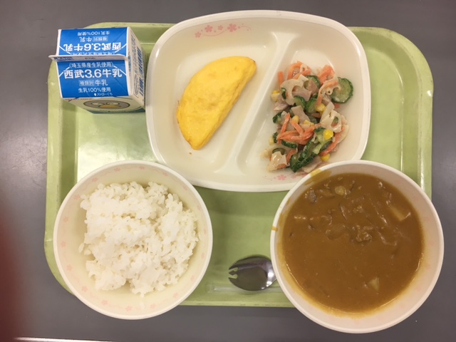 ポークカレー・オムレツ・れんこんサラダ・牛乳でした。