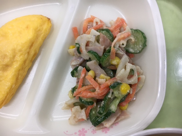 ポークカレーは、南中オリジナルのカレーです。もう定番になっているので、1年生も辛さにはなれたようです。れんこんサラダは、旬を迎えるれんこんをたっぷりと使ったサラダです。