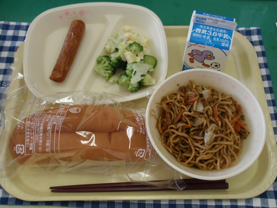 コッペパン 牛乳 焼きそば 焼きウインナー チーズサラダ エネルギー:617kcal たんぱく質:26.1g 脂質:26.8g 炭水化物:72.9g 食塩相当量:2.3g