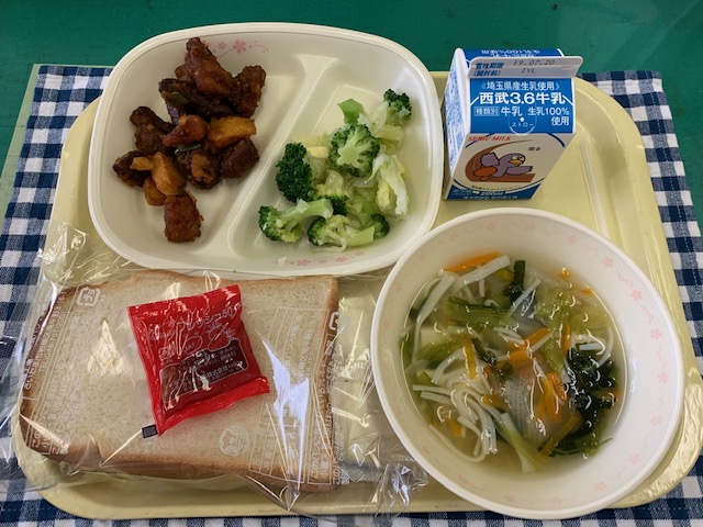ごはん 牛乳 サワラの明太マヨ焼き 骨太サラダ スタミナスープ エネルギー:585kcal たんぱく質:27.2g 脂質:19.7g 炭水化物:79.6g 食塩相当量:2.3g