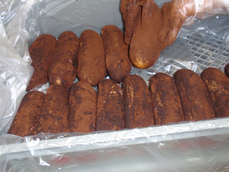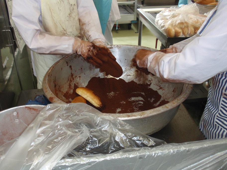 調理員さんがひとつひとつ揚げたコッペパンにたっぷりココアをまぶしてくれています。